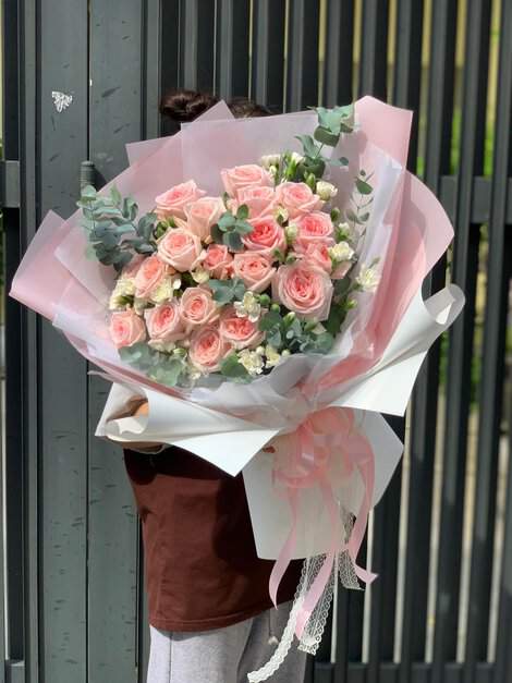 Bó hoa được bao bọc bởi lớp giấy hồng pastel mềm mại, kết hợp nơ đỏ tươi nổi bật – là món quà hoàn hảo cho dịp sinh nhật người yêu, vợ hoặc bạn gái.