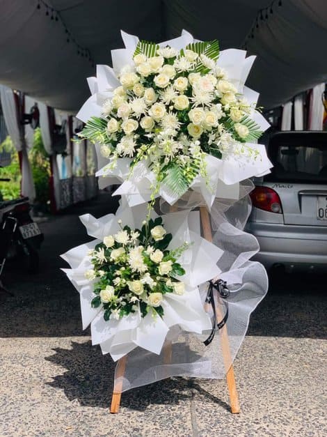 🌸 Lan Thái tím: Được sử dụng cho cả tầng hoa trên và vòng hoa dưới; sắc tím tượng trưng cho sự trân trọng, thành kính và nỗi tiếc thương sâu lắng.