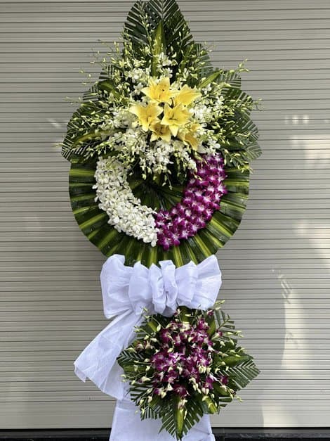 Kệ hoa chia buồn được thiết kế 2 tầng, sử dụng tone màu vàng – đen chủ đạo, tạo nên vẻ đẹp trang trọng và đầy cảm xúc.